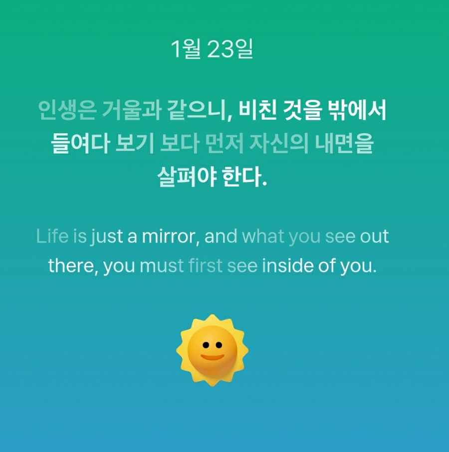 인생은 거울과 같으니, 비친 것을 밖에서 들여다 보기 보다 먼저 자신의 내면을 살펴야 한다.