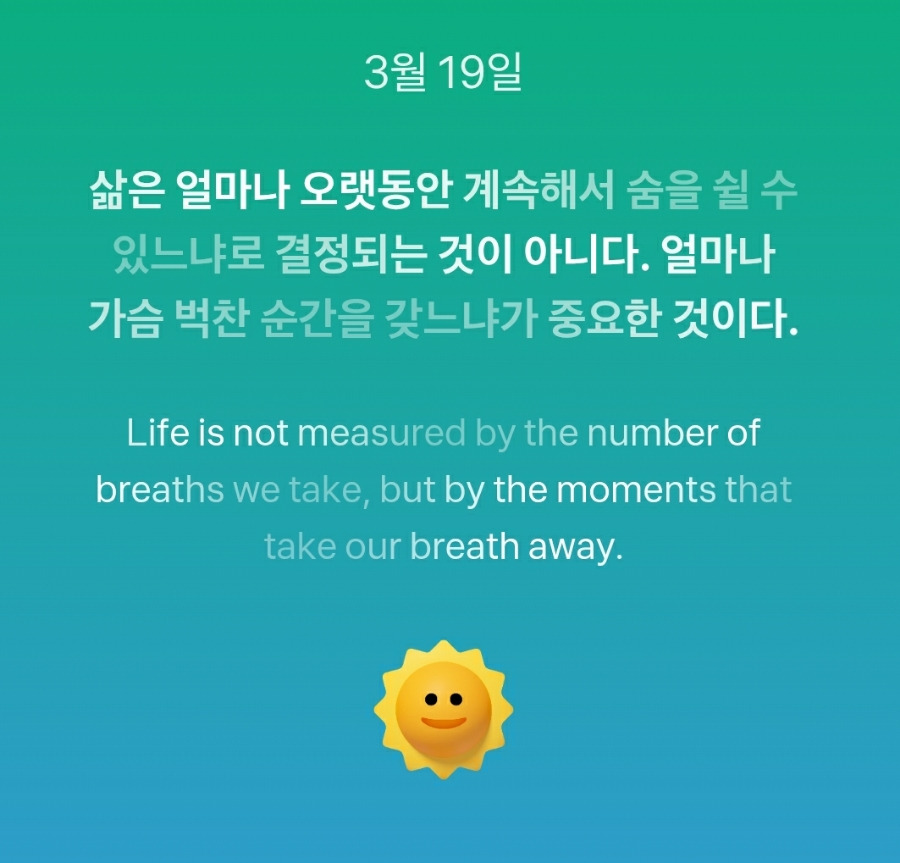 삶은 얼마나 오랫동안 계속해서 숨을 쉴 수 있느냐로 결정되는 것이 아니다. 얼마나 가슴 벅찬 순간을 갖느냐가 중요한 것이다.