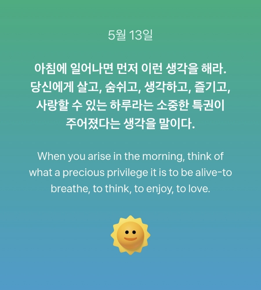 당신에게 살고, 숨쉬고, 생각하고, 즐기고, 사랑할 수 있는 하루라는 소중한 특권이 주어졌다는 생각을 말이다.