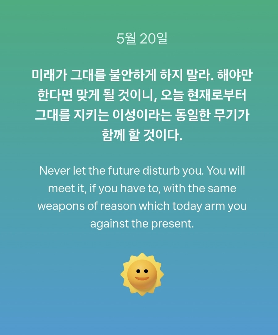 미래가 그대를 불안하게 하지 말라. 해야만 한다면 맞게 될 것이니, 오늘 현재로부터 그대를 지키는 이성이라는 동일한 무기가 함께 할 것이다.